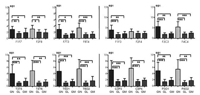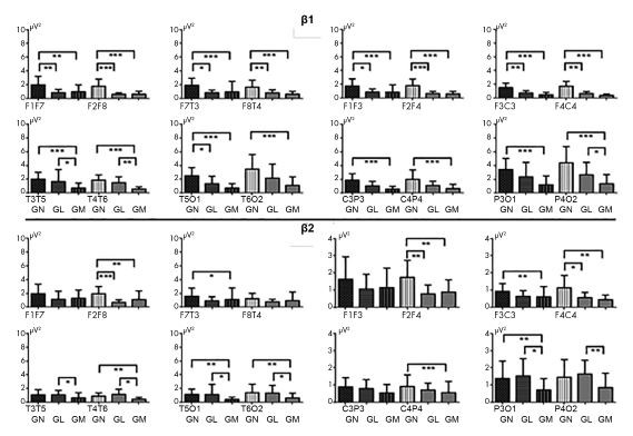 El PPA de β1 fue significativamente mayor en GN en todas las derivaciones. Además, se registró disminución del PPA de β1 de GL a GM en las derivaciones témporo-temporales de AH y en las parieto-occipital derecha (figura 3).