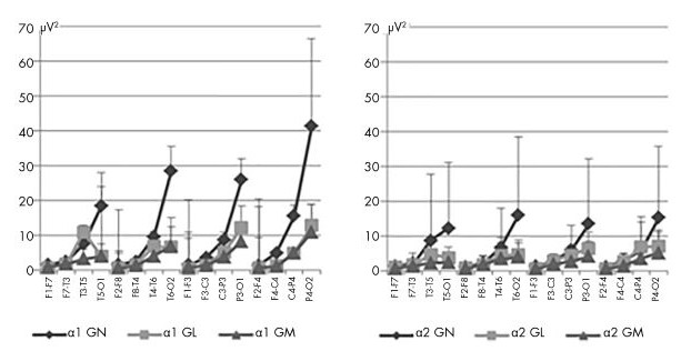 El perfil de α1 fue de ascenso fronto-occipital en los tres grupos, con mayor intensidad y variabilidad en GN, a diferencia de los otros dos grupos, en los que su perfil es similar. El perfil del PPA de α2 fue también de ascenso en los tres grupos, con mayor intensidad y variabilidad en GN, seguido de GL y, al último, GM (figura 4).