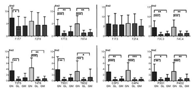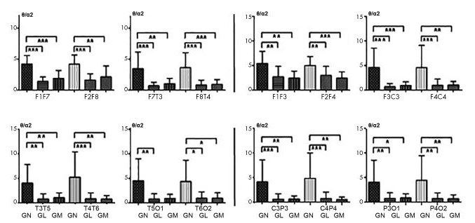 En contraste, el índice θ/α2 disminuyó en GN respecto a los otros grupos, en todas las derivaciones, excepto en T5O1 para el GM (figura 6).