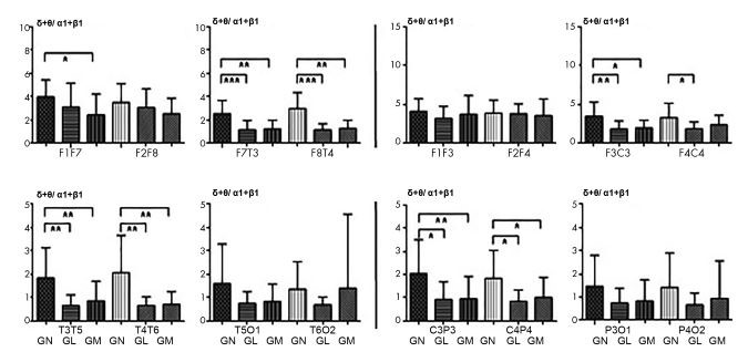 El índice θ/β2 disminuye de GN a los otros grupos, excepto para GL en F2F8 y F2F4 y el índice de δ+θ/α1+β1 que presentó valores similares en derivaciones témporo- y parieto-occipitales de AH, así como en F1F3, F2F4 y F2F8. En las otras derivaciones, los valores fueron significativamente menores en GL y GM comparados con GN (figura 8).