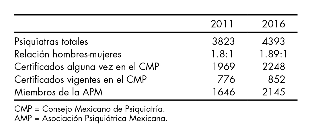En México, en el año 2016 se encuentran registrados ante el CMP 2 248 (51.17% del total de psiquiatras en el país), de ellos únicamente 852 (19.39% del total) cuentan con certificación vigente. Mientras tanto, 2 145 psiquiatras (48.82% del total del país), se encuentran registrados en la APM sin que se cuente con datos con respecto al número exacto de integrantes activos y vigentes (cuadro 1, gráfica 1).