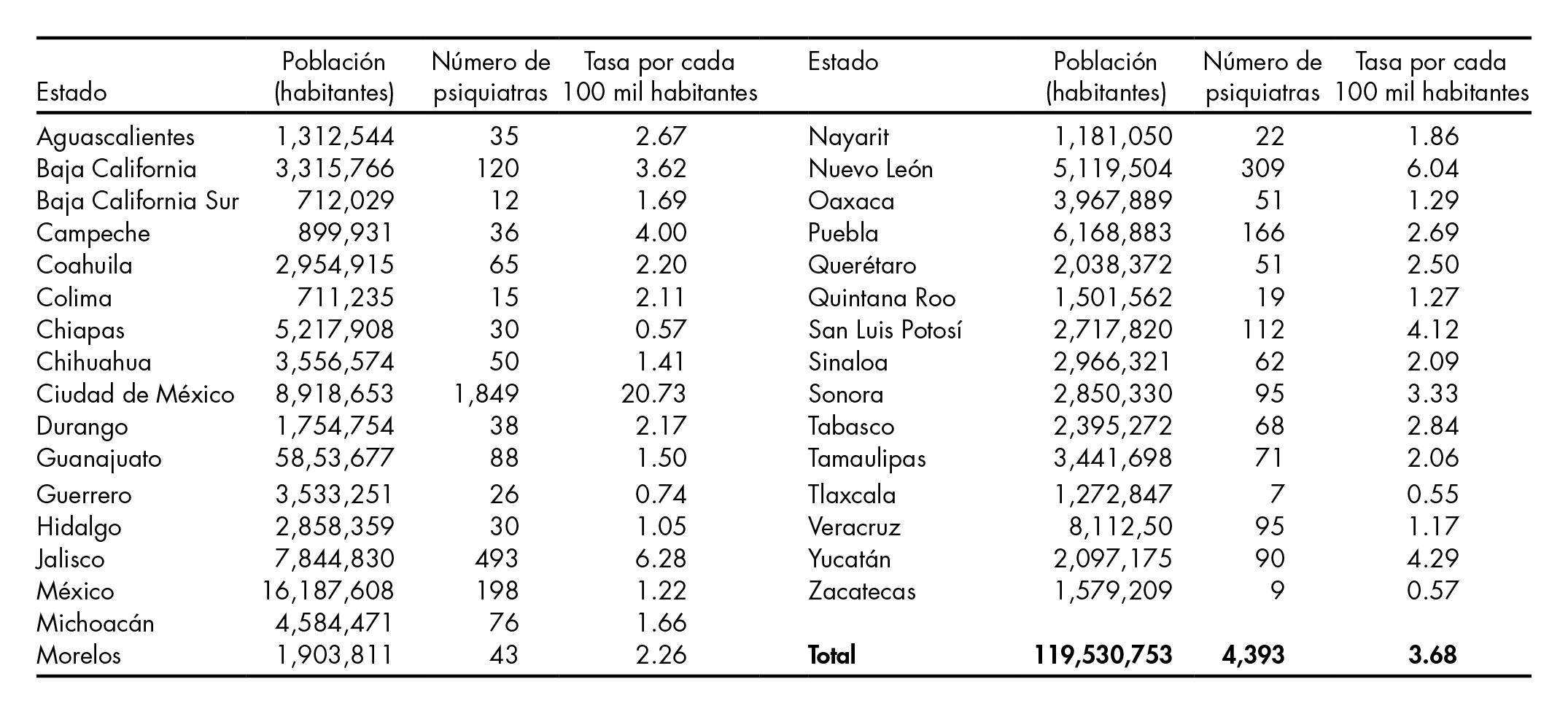 Por otra parte, nueve Estados de la República Mexicana (Tlaxcala, Zacatecas, Chiapas, Guerrero, Hidalgo, Veracruz, Estado de México, Quintana Roo y Oaxaca), donde habita un tercio de la población del país (44 de casi 120 millones de habitantes), presentan una tasa de apenas 0.94 psiquiatras por cada 100 000 habitantes, 20 veces menos que la tasa de la Cuidad México. Más aún, Estados como Tlaxcala, Zacatecas y Chiapas, tienen entre los tres, para una población de ocho millones de habitantes, 46 psiquiatras, lo que genera una tasa de 0.57 psiquiatras por cada 100 000 habitantes, ubicando a estas regiones del país en rangos que presentan países con bajos/medianos ingresos.8