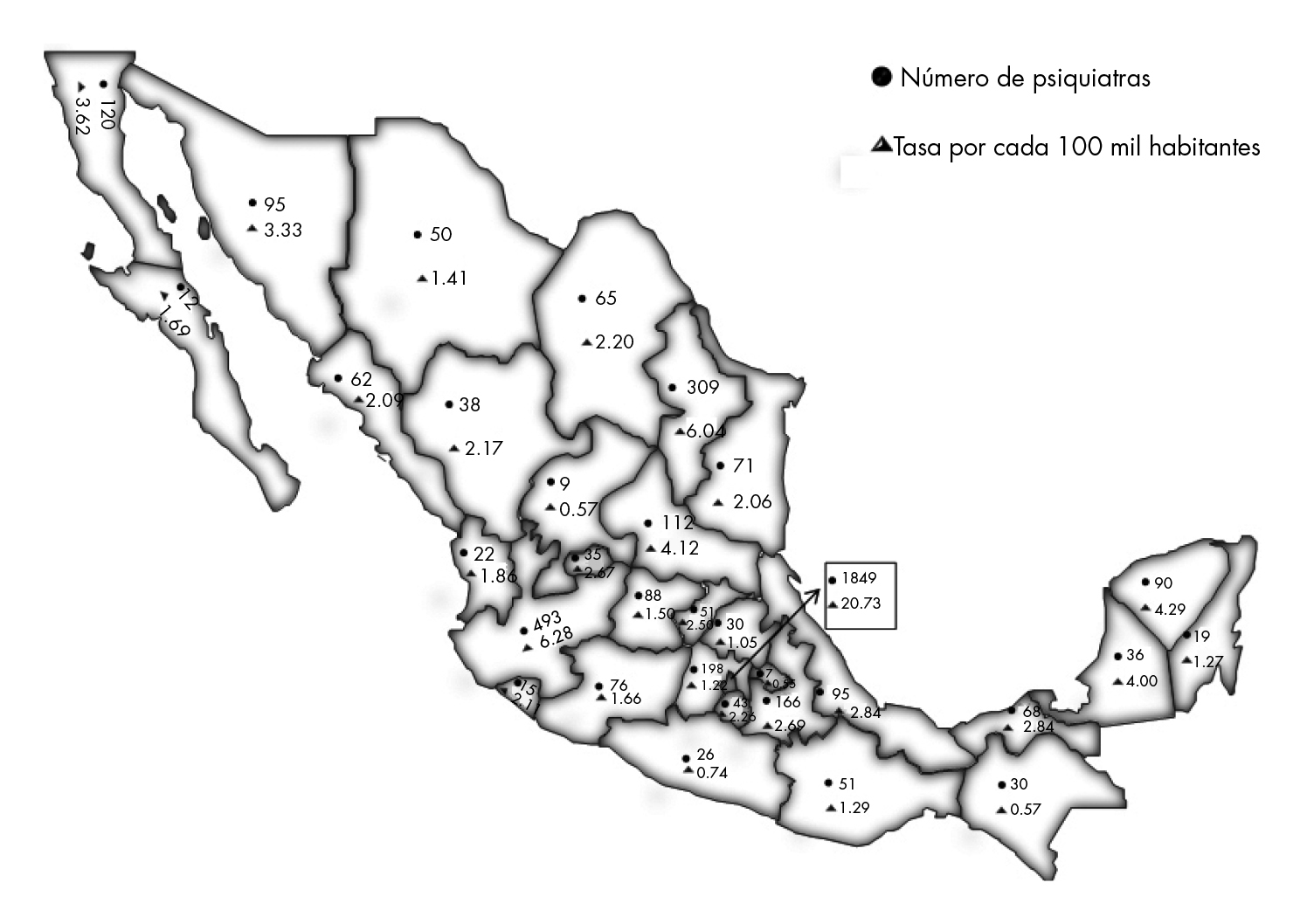 La distribución muestra que todos los Estados de la República Mexicana cuentan con un determinado número de psiquiatras. El 42.09% del total de especialistas ejerce en la Ciudad de México, en el Estado de Jalisco ejerce el 11.22% y en el de Nuevo León, el 7.03% del total de los especialistas. Los tres Estados con mayor número de psiquiatras concentran al 60.34% del total de psiquiatras en México; el 39.66% restante se encontró distribuido en las 29 entidades federativas restantes y concentrados principalmente en zonas urbanas. Los Estados con menor número de psiquiatras son Tlaxcala, Zacatecas, Baja California Sur, Colima y Querétaro, los que en conjunto suman el 1.5% (62 especialistas) del total de psiquiatras del país.