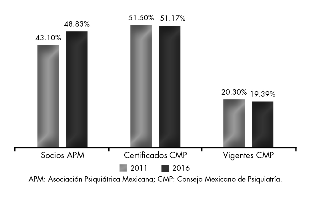 Aunado a lo anterior, al revisar el porcentaje de profesionistas afiliados a la sociedad médica especializada en psiquiatría de mayor tradición en el país, la APM, encontramos que el 48.8% se encuentra afiliado, y que su número se incrementó en un 5% en cinco años; sin embargo, sus datos no son del todo precisos ya que no cuentan con información que discrimine entre afiliados vigentes y activos contra afiliados no vigentes, dado que una vez afiliado no es necesario renovar o revalidar dicho estado para permanecer en sus registros.
