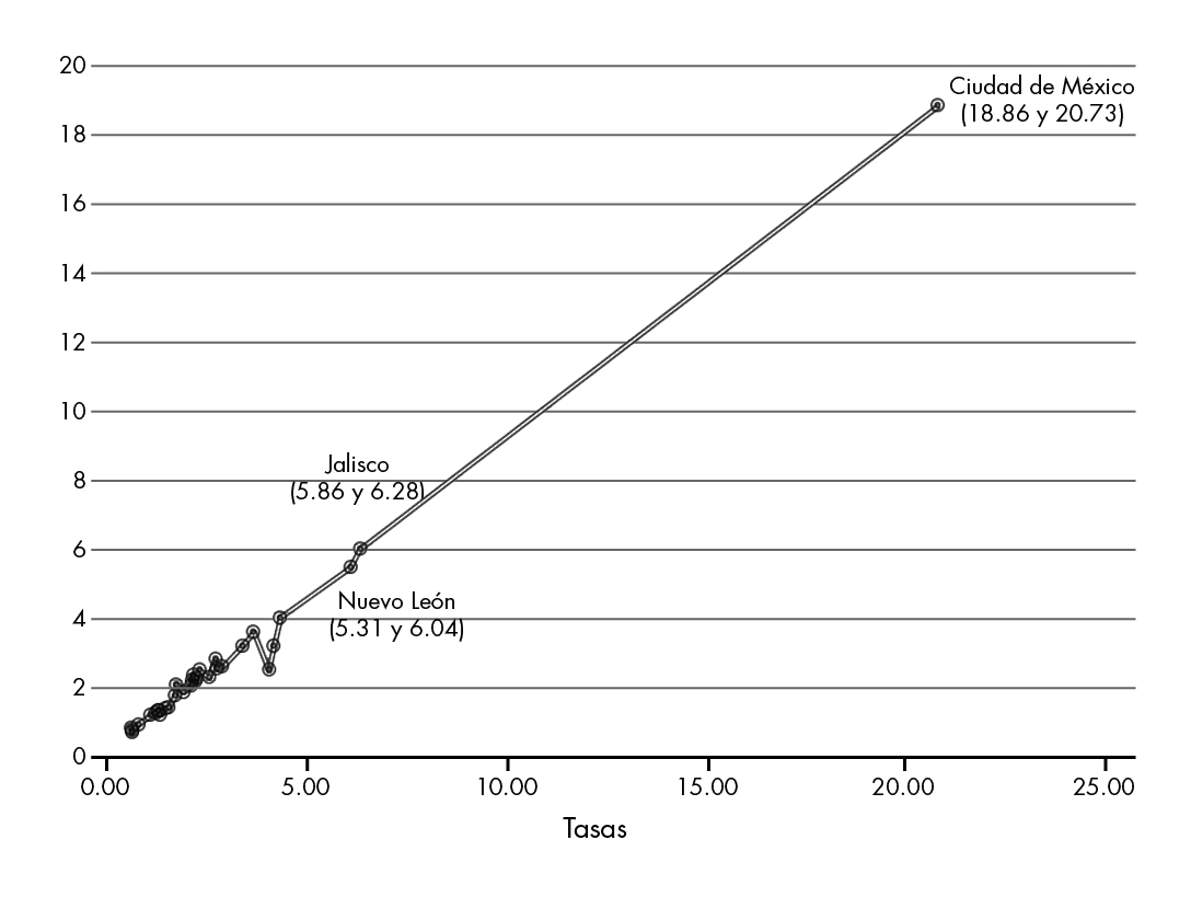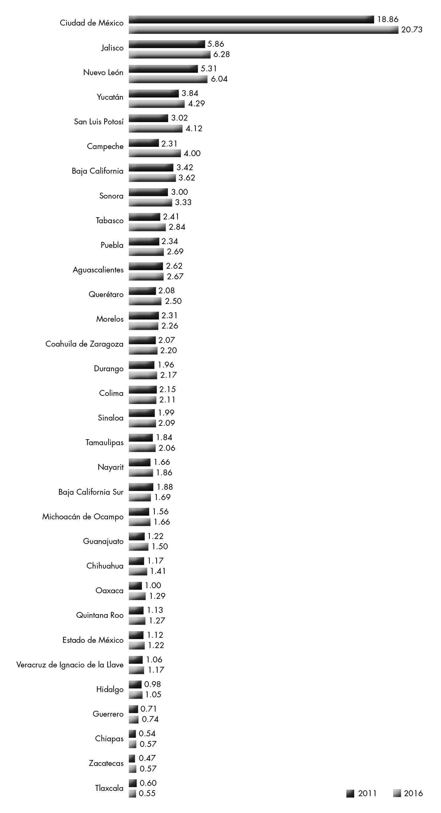 De los 32 Estados de la República Mexicana, la Ciudad de México es el que cuenta con la mayor tasa de psiquiatras, con 20.73 por cada 100 000 habitantes. En segundo lugar se ubica Jalisco con una tasa de 6.28 psiquiatras por cada 100 000 habitantes, y en tercer lugar se encuentra Nuevo León con una tasa de 6.04 por cada 100 000 habitantes (figura 1). En cambio, la tasa estatal más baja la tuvo Tlaxcala, con 0.55 psiquiatras por cada 100 000 habitantes, seguido de Zacatecas y Chiapas, ambos con 0.57 psiquiatras por cada 100 000 habitantes (cuadro 2, gráfica 2).