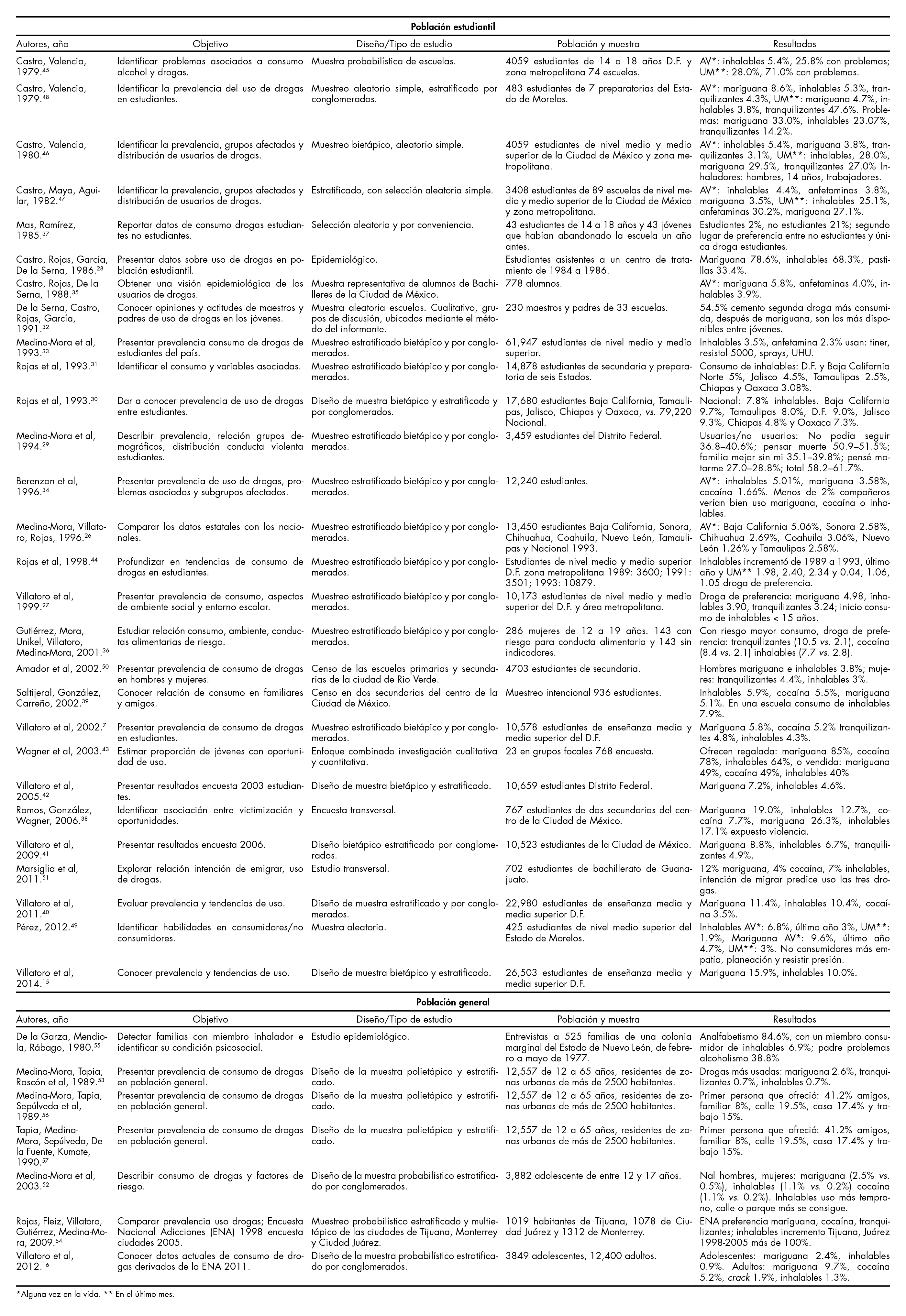 El análisis de las publicaciones obtenidas mostró que la investigación sobre el uso de drogas –incluidos los solventes inhalables– en nuestro país, inició alrededor de 1972 en el Centro Mexicano de Estudios en Farmacodependencia (CEMEF); a partir de entonces se han llevado a cabo diversos estudios empleando diferentes aproximaciones metodológicas.14,15,16,17,18