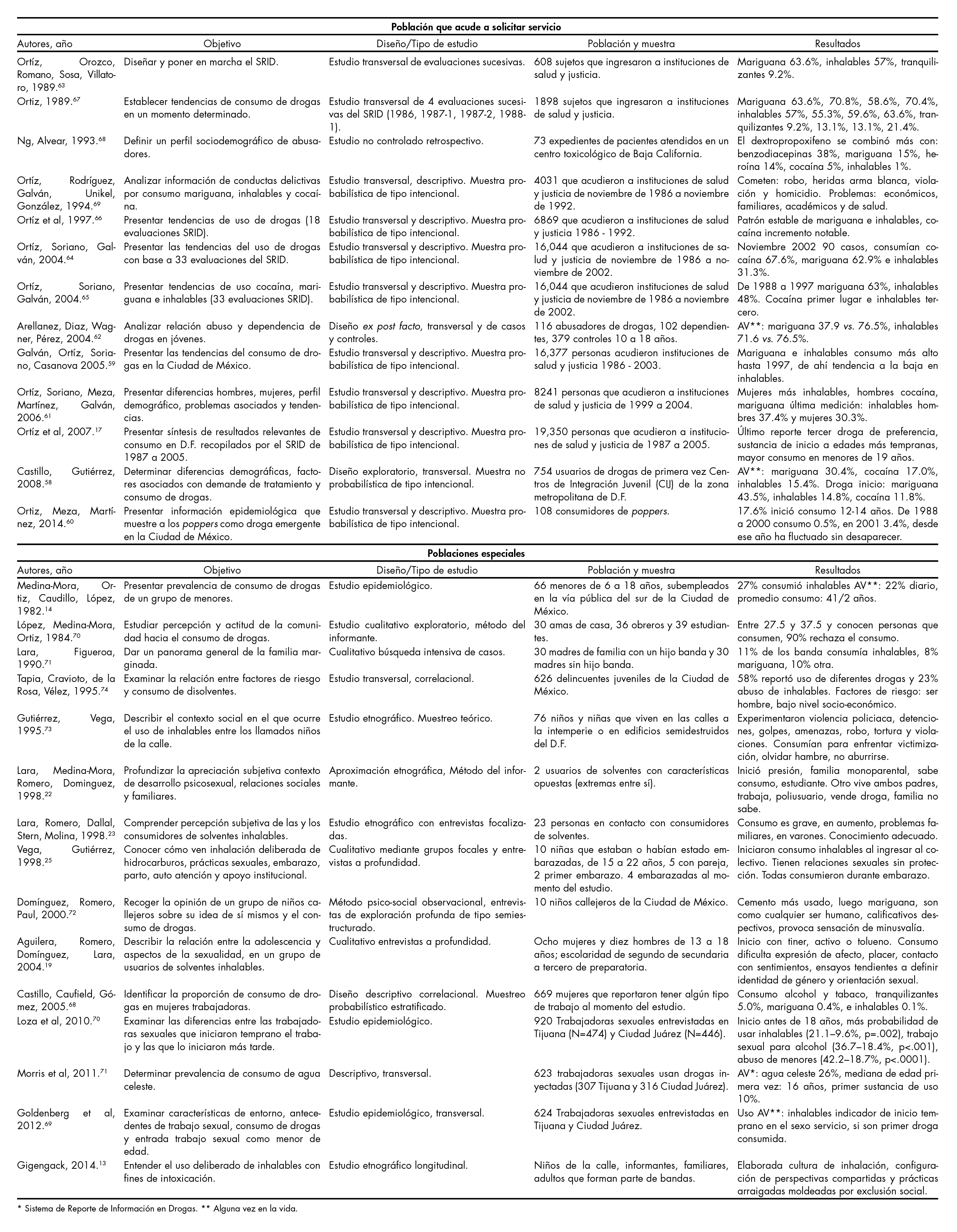 Resultados: Se identificaron 1083 artículos, 83 cumplieron con todos los criterios para ser incluidos en el análisis. Estos trabajos se realizaron en diferentes poblaciones: grupos marginales, integrantes de bandas juveniles, niños en situación de calle, adultos y menores recluidos en centros de detención, sexoservidoras, personas que acuden a solicitar tratamiento, estudiantes y población general.