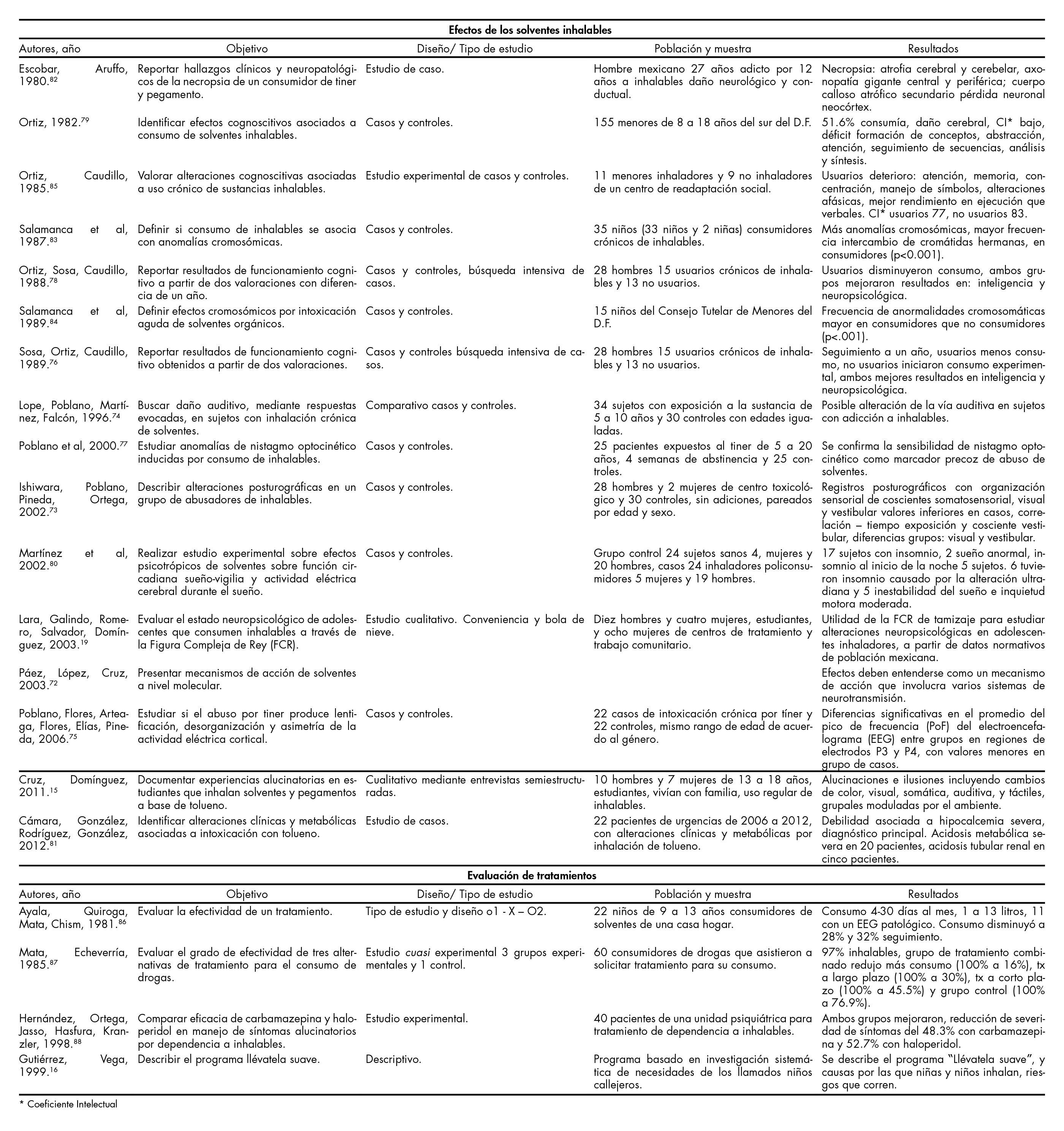 Por otro lado, Ortiz y Caudillo (1985),91 realizaron una evaluación cognitiva en un centro de readaptación social con niños que habían vivido en las calles e inhalado solventes, la media del coeficiente intelectual (CI) fue de 77, presentaron disminución de la memoria pasiva y receptiva, fallas en la formación de conceptos, abstracción y baja capacidad de juicio, análisis y síntesis. Sin embargo, los autores no atribuyeron de forma directa dichos problemas al uso de inhalables, ya que podrían deberse a carencias familiares, educativas y sociales o incluso a los efectos de la institucionalización. Otros estudios han encontrado un pobre rendimiento escolar y la presencia de conductas delictivas (cuadro 3).92