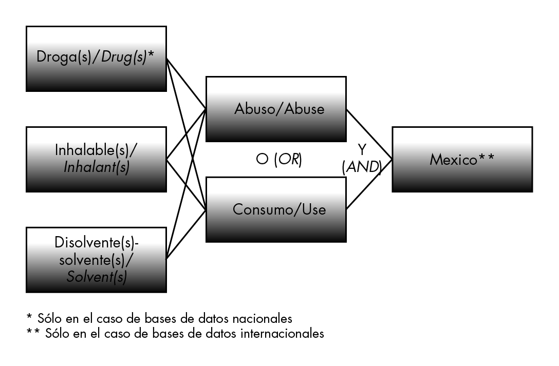 Se realizó una búsqueda bibliográfica entre agosto y septiembre de 2014 de los artículos publicados entre 1970 y 2014 sobre el consumo de solventes inhalables en México. Se incluyó en la búsqueda al archivo histórico de la Dirección de Investigaciones Epidemiológicas y Psicosociales (DIEPS) del Instituto Nacional de Psiquiatría Ramón de la Fuente Muñiz (INPRFM) y a la revista SALUD MENTAL, estas dos bases de datos fueron de suma importancia debido a que muchos de los artículos no figuran en las bases de datos electrónicas o bien, en éstas no aparece el texto completo, especialmente de las publicaciones de las décadas de 1970 y 1980; también se incluyeron las bases de datos Medline, Elsevier y Scielo México.12 La búsqueda se realizó utilizando diferentes términos, y sus combinaciones tanto en inglés como en español (figura 1).13