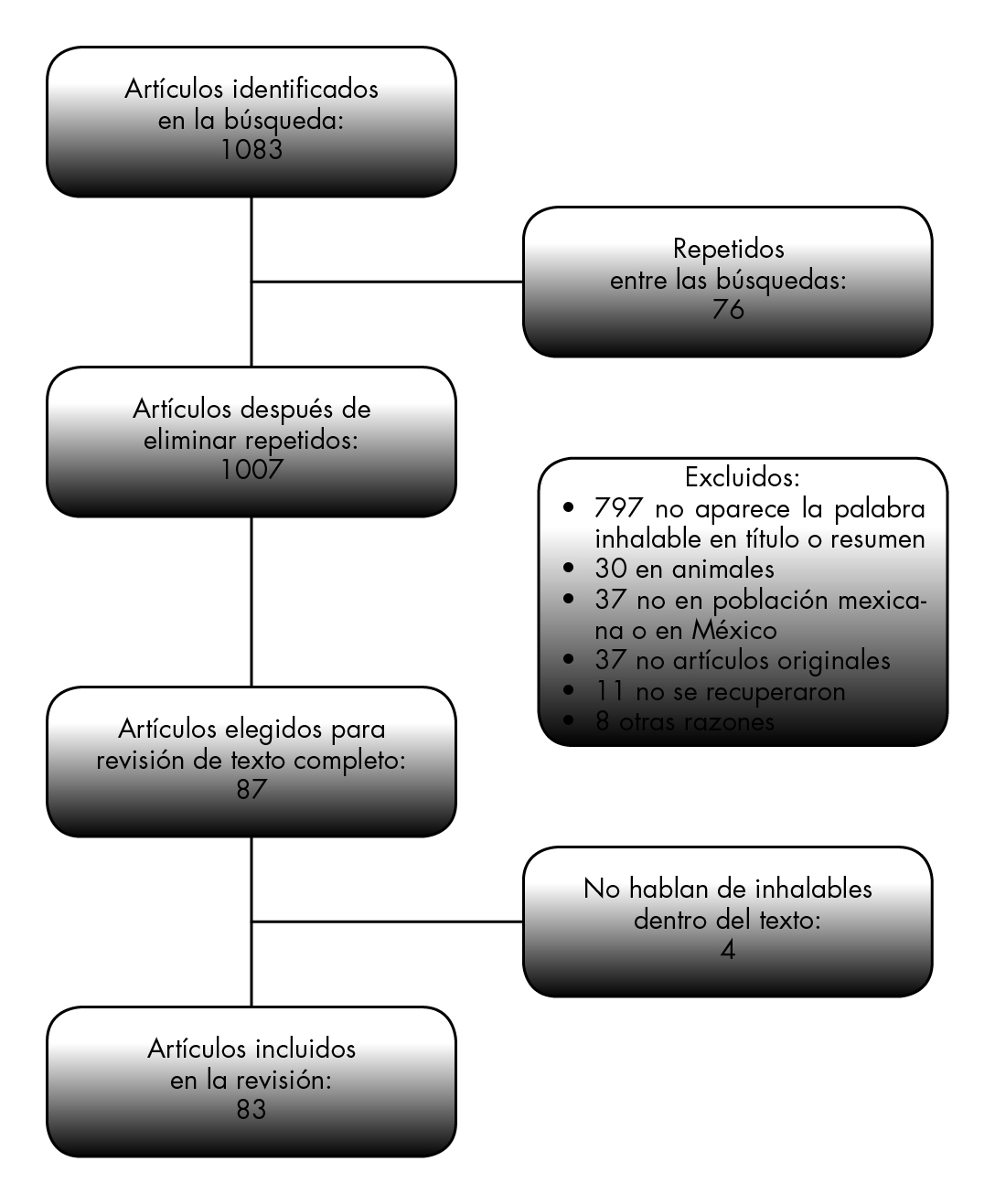 En la búsqueda se identificaron 1083 artículos, de los cuáles 76 se duplicaron en las distintas bases de datos. De las 1007 publicaciones restantes, 920 se excluyeron por diferentes causas que se explican en la figura 2. Se revisaron 87 artículos completos, de los cuales cuatro no tenían información acerca de solventes inhalables en el contenido, por lo que para el análisis de la información se incluyeron sólo 83 publicaciones.