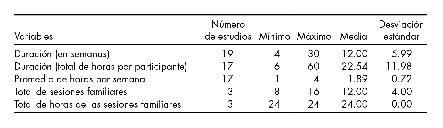 Referente al entrenamiento a familiares, sólo tres de las 19 intervenciones lo incluyeron. El promedio de tiempo dedicado a los familiares fue de 24 horas.