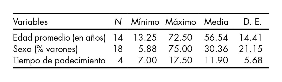 Características del participante: a) tipo de diabetes (DM1, DM2 o ambas); b) edad (promedio en años); c) sexo (% de hombres que participan en la muestra); d) tiempo de padecimiento (en años).