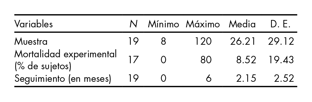 En lo que concierne a las características metodológicas, destaca que las muestras tuvieron un promedio de 26.21 participantes (DE = 29.12) y que el seguimiento que hubo para evaluar los resultados de las intervenciones, apenas rebasa los dos meses con un promedio de 2.15 meses (DE = 2.52 (cuadro 3).