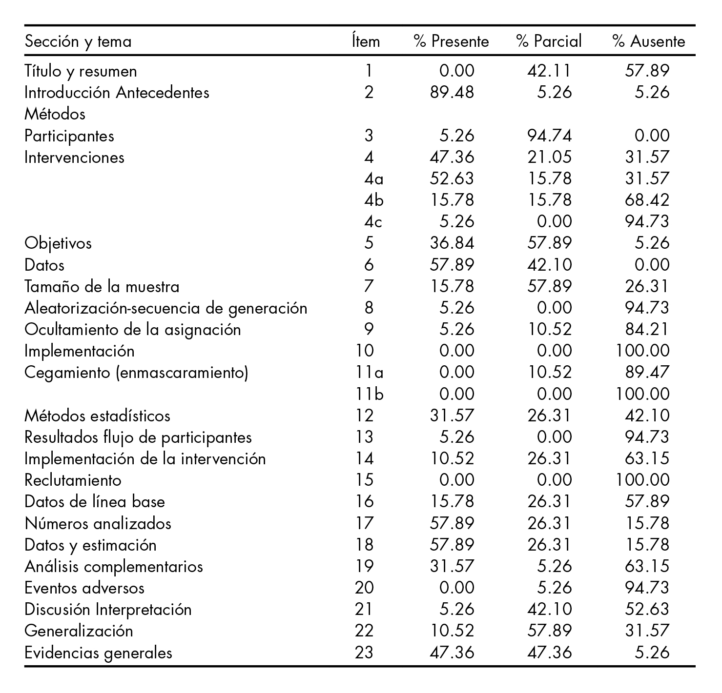 Características metodológicas: a) tamaño de la muestra; b) mortalidad experimental (número y porcentaje de sujetos que abandonan la intervención; c) seguimiento (en meses). Además, para la revisión del rigor metodológico, se utilizaron los criterios propuestos por el CONSORT. Publicado originalmente en 1996, es un conjunto de criterios usados para evaluar la presentación de reportes de investigación de ensayos controlados aleatorios, propuesto por un grupo de profesionales de la salud, estadísticos y editores.27 Con base en los principales criterios establecidos en el CONSORT, se creó una propuesta específica para la evaluación de los ensayos aleatorios de tratamiento no farmacológico como la psicoterapia y las intervenciones conductuales. Consta de 22 ítems contenidos en cinco secciones: 1. Título y resumen; 2. Introducción (antecedentes); 3. Método (participantes, intervenciones, objetivos, resultados, tamaño de la muestra, aleatorización-secuencia de generación, ocultamiento de la asignación, implementación, cegamiento y métodos estadísticos); 4. Resultados (flujo de participantes, implementación de la intervención, reclutamiento, datos de línea base, números analizados, datos y estimación, análisis complementarios y eventos adversos); 5) Discusión (interpretación, generalización, evidencias generales).24