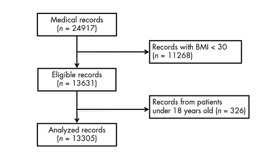 The medical records included in this analysis belong to patients who seek weight reduction treatment at outpatient community centers and endorsed obesity criteria established by the international standards from the World Health Organization (Class I: BMI of 30 to 34.9 kg/m2, Class II: BMI of 35 to 39.9 kg/m2; Class III or severe obesity: BMI greater than 40 kg/m2).33 Records from patients younger than 18 years old were excluded from the analysis (figure 1).