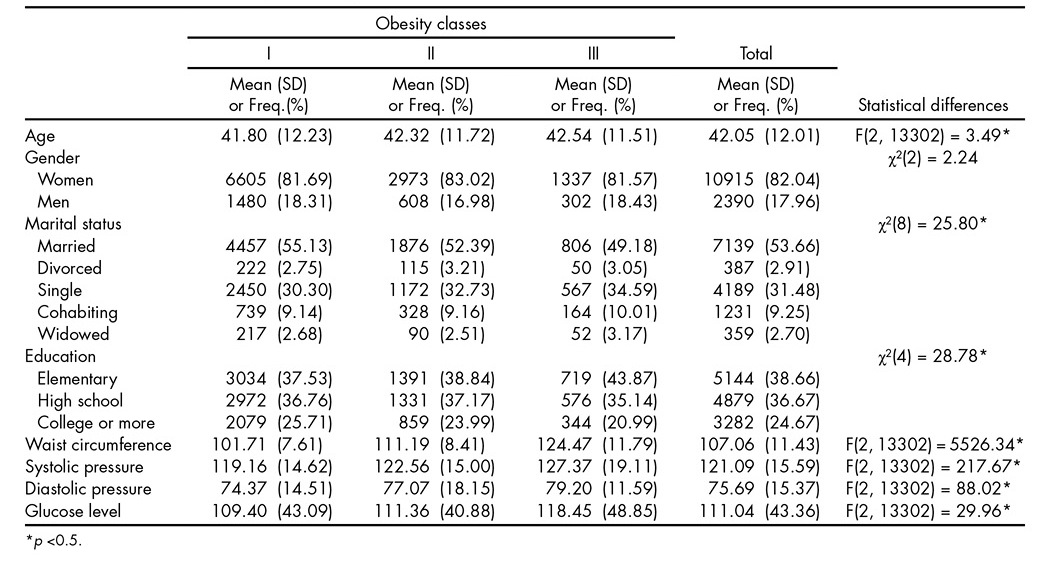 A total sample of 13,305 patients (records) met eligibility criteria, with a mean age of 42 (SD = 12) years old, and most of them were women, married, and with elementary or high school education. Mean BMI (SD) for obesity classes I, II and III were: 32.19 (1.41), 37.00 (1.40), and 43.97 (3.83) respectively; while in the whole sample mean BMI was 34.94 (SD = 4.39). Between groups (obesity class) significant differences were found in age, marital status, education, waist circumference, diastolic and systolic blood pressure, and glucose level (table 1).