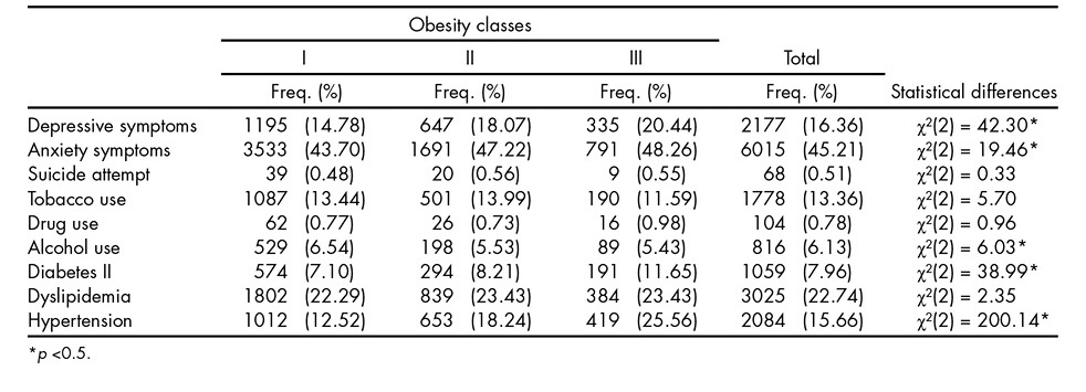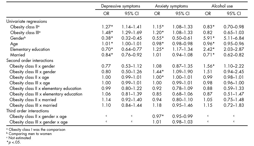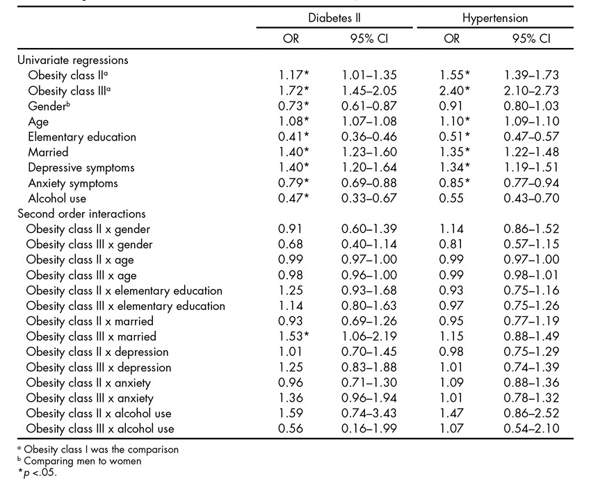 Results: Total sample was composed of 13,305 patients, mostly women (82.04%), married (53.66%), with elementary education (38.6%), mean body max index was 34.94 (SD = 4.39). The most prevalent psychiatric symptoms were anxiety (45.21%) and depression (16.36%). When analyzing interactions, it was found that men with class II obesity had higher odds for alcohol use (OR 1.56, IC 95% 1.10-2.22), and participants with obesity class III and married had more probability of diabetes II (OR 1.53, IC 95% 1.06-2.19).