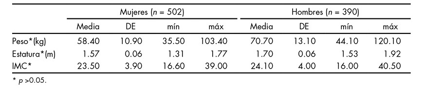 La muestra estuvo formada por 892 estudiantes de primer ingreso a la UAM-X, de los cuales 56.2%(502) fueron mujeres y 43.7% (390) fueron hombres. No se encontraron diferencias estadísticamente significativas sobre el peso corporal, la estatura o el IMC por sexo (cuadro 1). La edad promedio fue de 19.3 ± 2.4 años para las mujeres y 20.4 ± 3.3 años para los hombres (p < 0.05). Cerca de tres cuartas partes de las mujeres y poco más de la mitad de los varones se concentra en el grupo de edad de 19 años o menos (p < 0.05) (cuadro 2).