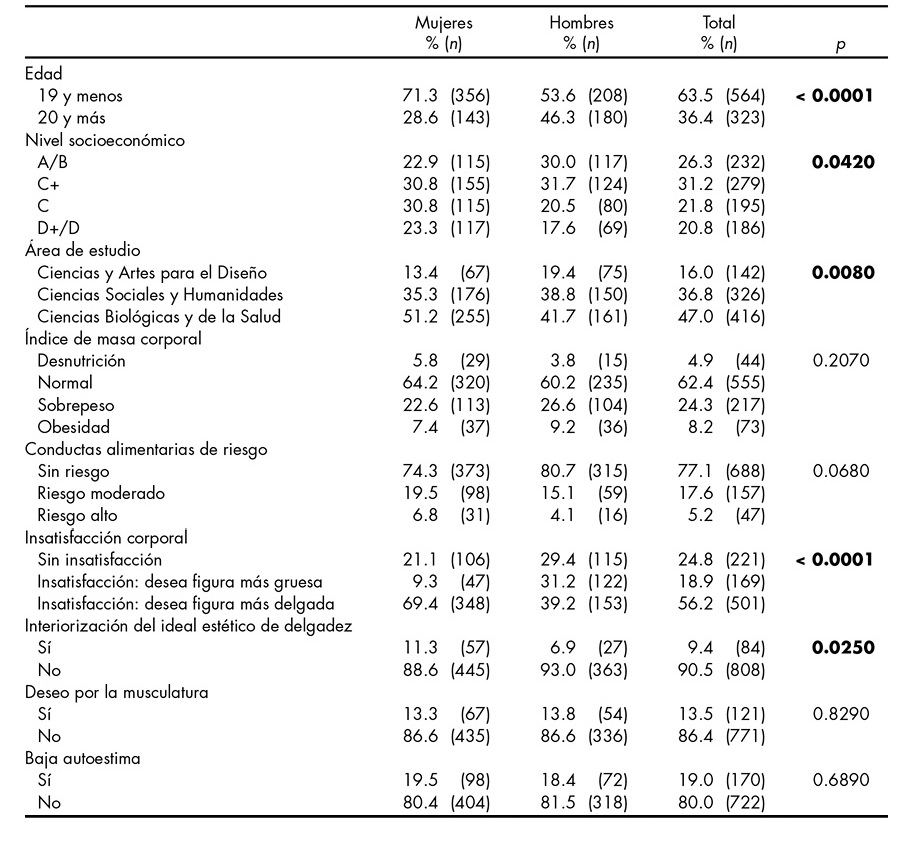 En relación con el NSE, se encontró una mayor proporción de hombres clasificados en el estrato más alto (30.0%), en comparación con las mujeres (22.9%) (p < 0.05). Se observa, asimismo, un mayor porcentaje de mujeres en las categorías de NSE más bajas en comparación con los hombres (23.3% vs. 17.6%) (p < 0.05). La mitad de las mujeres están inscritas en alguna de las carreras del área de las CBS, en comparación con los hombres (51.2% y 41.7%), mientras que un número mayor de varones está inscrito en el área de las CSH. Respecto a la distribución del IMC, 30.0% de las mujeres y 35.0% de los hombres presentaron sobrepeso y obesidad (p > 0.05). El deseo por una figura más delgada y la IIED estuvieron presentes, respectivamente, en 69.0% y 11.0% de las mujeres.