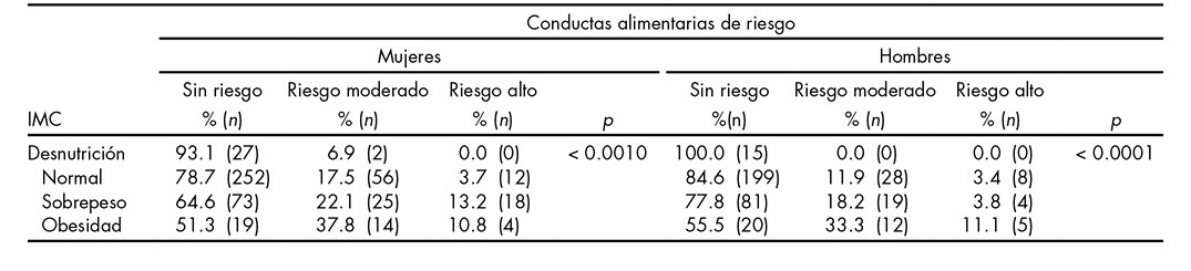 El índice de masa corporal (IMC) se ha asociado con las CAR en mujeres y hombres con sobrepeso y obesidad.8 Las CAR son conductas características de los trastornos de la conducta alimentaria (TCA) que se presentan en menor frecuencia e intensidad. Entre ellas se encuentran los atracones y las conductas restrictivas y purgativas, y junto con el sobrepeso y la obesidad se han considerado como factores de riesgo para el desarrollo de TCA.9