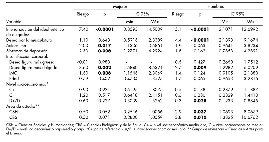 Los resultados mostraron también que existe riesgo para desarrollar CAR en las mujeres cuando se ha interiorizado el IIED; se desea un cuerpo musculoso, se presentan síntomas depresivos, se desea de una figura corporal más delgada y se presenta un mayor IMC. Por su parte, en los hombres, las variables que mostraron riesgo fueron la IIED, el DM, el deseo de una figura corporal más delgada y estudiar una carrera de las áreas de estudio CBS y CSH.19,20,38