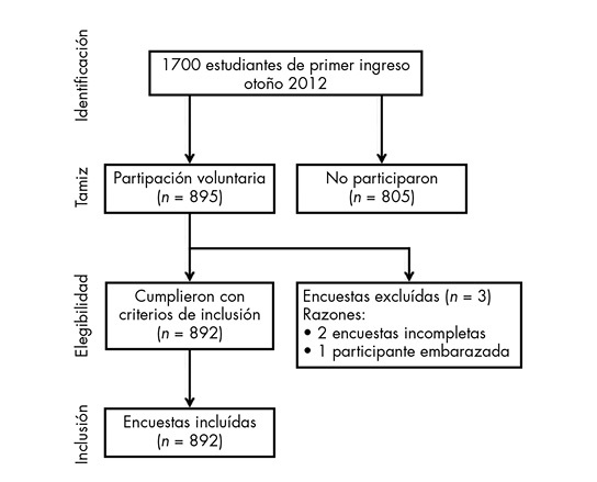 Fueron invitados a responder una encuesta todos los estudiantes de primer ingreso al ciclo escolar de otoño de 2012 de la Universidad Autónoma Metropolitana, Unidad Xochimilco (UAM-X), en la Ciudad de México. Previamente a la aplicación de la encuesta, se pidió a los sujetos su consentimiento por escrito, indicando la participación voluntaria y la confidencialidad de la información. Los criterios de inclusión fueron ser alumno de primer ingreso a la UAM-X en el período de estudio y aceptar la participación voluntaria; los criterios de exclusión fueron el no aceptar participar en el estudio, no concluir la encuesta, y, en el caso de las mujeres, estar embarazada. En la figura 1, se muestra la inclusión de los sujetos en la muestra, la cual quedó constituida por 892 estudiantes (502 mujeres y 390 hombres) que correspondió a una tasa de respuesta de 51.8% de la población de nuevo ingreso inscrita a la universidad durante el período de observación.