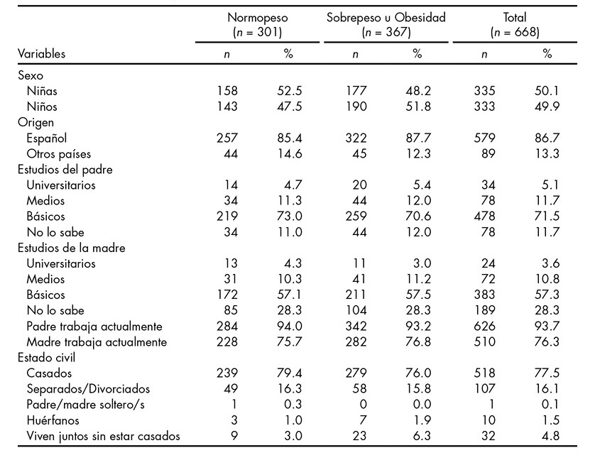 De los 301 preadolescentes que presentaban normopeso (M = 10.90; DT = 0.94), el 47,5% eran de sexo masculino; el 85.4% eran españoles y el resto eran nacidos en otros países. Respecto a su situación familiar, la mayoría de los participantes (79.4%) tenían padres casados. El nivel de estudios de los padres y madres era mayoritariamente básico (73% de los padres y 57.1% de las madres). En relación con la situación laboral, un alto porcentaje de padres (94%) y de madres (75.7%) estaban en situación activa. En el grupo de sobrepeso y obesidad (M = 10.81; DT = 0.99), el 51.8% de los participantes eran de sexo masculino; el 87.7% eran españoles y el resto nacidos en otros países. La mayoría de los preadolescentes (76%) tenían padres casados, con un predominio de estudios básicos en los padres (70.6%) y en las madres (57.5%). Además, la mayoría de los padres se encontraban en situación activa (93.2% de los padres y el 76.8% de las madres). En el cuadro 1 se presentan los datos sociodemográficos de la muestra.