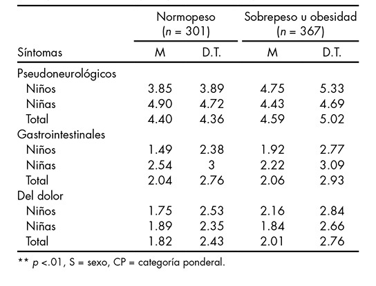 Resultados: No se hallaron diferencias significativas en función de la categoría ponderal en la manifestación de síntomas somáticos. Las diferencias fueron significativas únicamente en función del sexo, presentando las niñas más síntomas gastrointestinales que los niños (F [1,666] = 8.71; p = .003). Al examinar la sintomatología en cada subgrupo, se hallaron diferencias entre los niños con normopeso y obesidad/sobrepeso, mostrando estos últimos más falta de energía o cansancio (χ2 = 5.35; p < .05), dificultad para respirar (χ2 = 7.51; p < .01), convulsiones (χ2 = 4.12; p < .05) y mala digestión (χ2 = 4.89; p < .05). Además, fue mayor el porcentaje de niños con normopeso que no tiene ningún familiar enfermo respecto a los que presentaron obesidad o sobrepeso (χ2 = 2.47; p < .01).