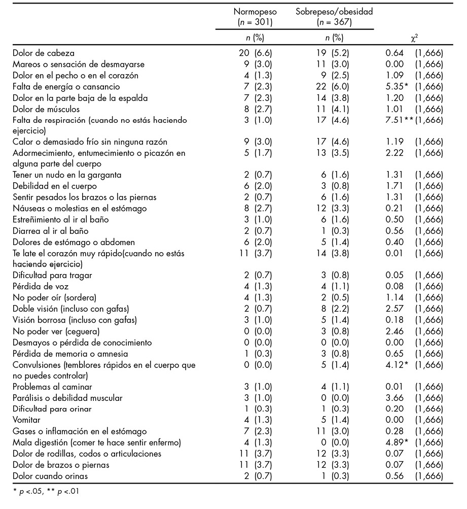 Results: No significant differences in gastrointestinal symptoms, pseudoneurological symptoms and pain in function of the weight category were found. Differences were only significant in function of gender, showing girls more gastrointestinal symptoms than boys (F [1,666] = 8.71; p = .003). When examining each somatic symptom, differences were found depending on the weight category, showing participants with overweight or obesity more fatigue (χ2 = 5.35; p < .05), breathing problems (χ2 = 7.51; p < .01), seizures (χ2 = 4.12; p < .05), and poor digestion (χ2 = 4.89; p < .05). The percentage of participants with overweight or obesity who had a sick relative was higher comparing to those with normal weight (χ2 = 2.47; p < .01).