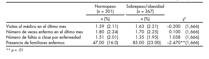 Diferencias en el número de visitas al médico, veces que han estado enfermos y faltado a clase por enfermedad, y en tener familiares enfermos en función de la categoría ponderal