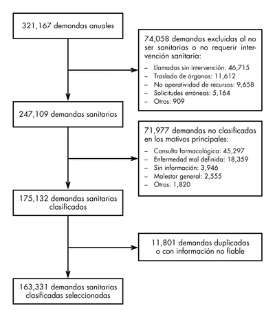 La base de datos analizada consta de un total de 321 167 demandas. Para este estudio se eliminaron las demandas de tipo no sanitario que son aquellas que no implicaban la atención a personas con necesidades sanitarias (n = 74 058) y, por otro lado, las que no fueron clasificadas en ninguna categoría por el CCUE (n = 71 977), ya que la información no se ajustaba a ninguna de las categorías de dicho sistema de clasificación. Estas últimas demandas fueron eliminadas para evitar los sesgos que pudieran provocar, ya que la mayoría fueron demandas farmacológicas o inespecíficas. Además se realizó un control de calidad de la base de datos y se eliminaron los duplicados (coincidían el número identificativo, la fecha y la hora) y errores de registro (11 801). Por lo tanto, se han incluido todas aquellas demandas que provocaron un consejo sanitario (algún tipo de indicación por parte del CCUE sin necesidad de movilizar un recurso), la asignación de un recurso (algún tipo de atención sanitaria in situ) o una derivación a otro dispositivo sanitario (traslado a un hospital) y que estaban clasificados en alguna de las categorías específicas que utiliza el CCUE (n = 163 331). Información más detallada del proceso de selección de la muestra aparece en la figura 1.
