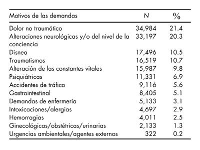 Se han analizado 163 331 demandas a los SUEMP. De estas demandas, 33.3% requirieron traslado sanitario; de ellas, 59.5% se realizó mediante ambulancia medicalizada, 22.9% con ambulancia básica sin equipo médico y 17.6% con otro tipo de recurso o no se recogió la información. De las que no presentaron traslado sanitario (66.7%), en el 41.5% la asistencia se realizó en el domicilio, 21.0% se resolvieron mediante consejo sanitario por el operador/a, 7.8% fueron anuladas por el usuario y 29.7% tuvieron otro tipo de resolución. En cuanto a la prioridad: 14.4% se clasificó como emergencia, 61.9% como urgencia no demorable, 13.8% como urgencia demorable y 9.9% como avisos domiciliarios. La distribución de las demandas clasificadas por el CCUE en el año de estudio aparece en la tabla 1, siendo la más frecuente el dolor no traumático (21.4%), seguida por las demandas por alteraciones neurológicas y/o nivel de la conciencia (20.3%). El número de demandas psiquiátricas fue de 11 331, situándose en el sexto lugar (6.9%).