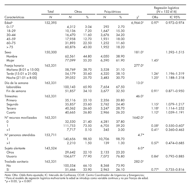 La comparación de las demandas psiquiátricas con las no psiquiátricas se muestra en la tabla 2. El 49.6% de las demandas psiquiátricas fueron para atención de personas entre 18 y 44 años. Sólo 2.7% fueron para personas menores de 18 años y 30% fueron para personas mayores de 60 años. En lo referente al sexo, las demandas psiquiátricas estuvieron asociadas con el sexo femenino (61.9%) con respecto a las no psiquiátricas (57.2%; p < 0.001). Se produjeron en menor porcentaje por la mañana (31.1% vs 38.7%), aumentando por la tarde (38.1% vs 35.6%) y la noche (30.8% vs 25.7%) (p < 0.001). El porcentaje de demandas psiquiátricas en fin de semana fue menor en comparación al de las otras demandas y fueron más frecuentes en el 2º y 3º trimestre con respecto a las no psiquiátricas (p < 0.001). Se destaca que sólo el 3.0% movilizó más de un recurso frente al 5.1% de las demandas no psiquiátricas (p < 0.001). El número de personas atendidas fue significativamente menor en las demandas psiquiátricas (p < 0.05). En cuanto al sujeto alertante, en las demandas psiquiátricas fue menos probable que fuera el propio usuario (76.8%) en comparación con las no psiquiátricas (77.9%; p < 0.05). Las demandas psiquiátricas requirieron traslados sanitarios (26.1%) en menor medida que las demandas de otro tipo (33.9%; p < 0.001).