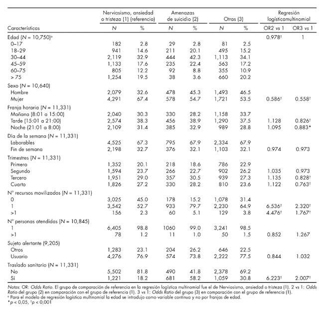 El porcentaje de los diferentes grupos dentro de las demandas psiquiátricas fue el siguiente: nerviosismo, ansiedad o tristeza (59.3%), amenazas de suicidio (10.3%) y otras (30.4%). Las demandas categorizadas como amenazas de suicidio en comparación con las categorizadas como nerviosismo, ansiedad o tristeza se caracterizaron por una menor edad (OR = 0.978), por estar menos asociadas al género femenino (OR = 0.586), por movilizar más recursos (1 vs 0, OR = 6.536; > 1 vs 0, OR = 4.476) y requerir más traslados sanitarios (OR = 6.223). Las diferencias entre los tres grupos de demandas psiquiátricas aparecen resumidas en la tabla 3.