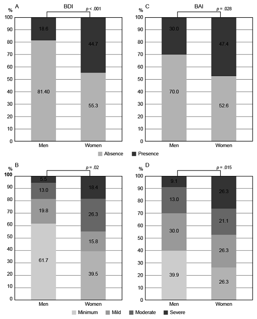 Comorbid anxiety and depression symptoms were found in 51 study participants (17.5%). Thirty-four percent (n = 13) of women had dual symptoms versus 15% (n = 38) of men (x2 = 8.41, p = .006). As expected, the BDI and BAI scores were associated with a coefficient in women of r = 0.59, p < .001 and in men of r = 0.69, p < .001.