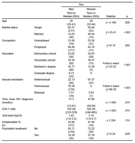 In bivariate analysis of sociodemographic variables, we found significant differences between men and women. All women self-identified as heterosexual, while only 22.13% (n = 56) of men did (χ2 = 86.39, p < .001). Women in the study were older than men (median age women = 39, men = 35, z = -2.18, p = .028); 40.54% of the women were married, compared to 14.23% of the men (χ2 = 47.32, p < .001). Women had significantly less years of schooling than men (52.63% of women had only studied up to elementary school versus 23.2% in men, χ2 = 22.52, p < .001). More women than men lacked a paid employment (55.26% versus 31.60%, χ2 = 75.99, p < .001), since a large percent of women self-described as housewives. As for clinical variables, we found no differences in viral load, CD4 T cell counts or time since diagnosis, but more women than men reported being under psychiatric treatment (27.78% of women versus 14.29% of men, χ2 = 4.24, p = .039) (table 1).