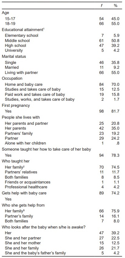 The mothers had a mean age of 17.51 (± 1.3) years and the infants a mean age of 12.82 (± 6.64) weeks. They had completed or were attending middle school (50.8%) or high school (39.1%) and lived with their partners (55.0%), either just with their partners (24.2%), with her parents (20.8%) or his parents (19.2%) ( Table 1 ).