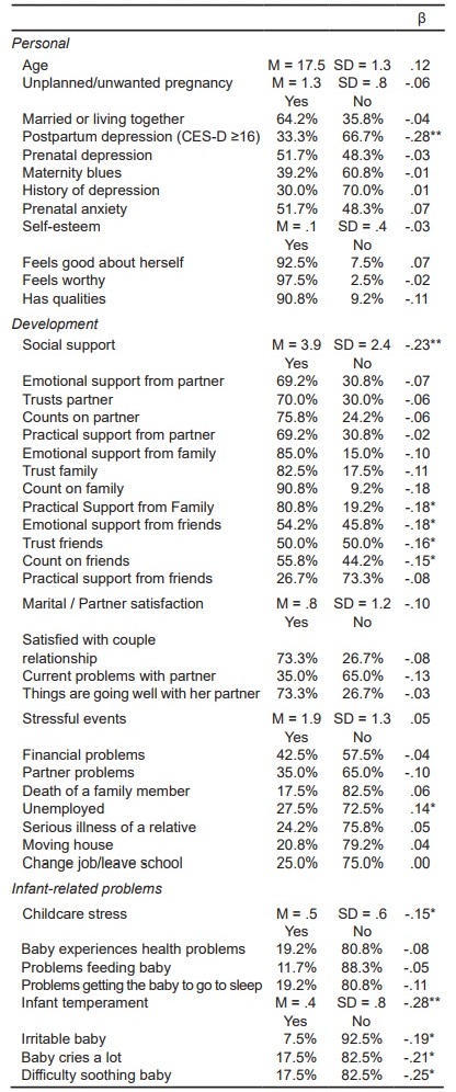 Resultados: Al ajustar por otras variables, los síntomas de depresión y el temperamento infantil difícil se asociaron con más baja PEM. El apoyo social se asoció con mayor PEM sólo en los análisis bivariados.