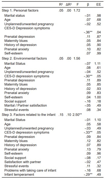 Of the personal variables, only depression (CES-D) was significant (β = -.28; p = .00); of the environmental ones, social support was significant (β = -.23; p = .00), and of this subscale, practical support from the family (β = -.18; p = .02), emotional support from friendships (β = -.18; p = .03), relying on friendships (β = -.16; p = .04) and having friendships (β = -.15; p = .04) were significantly related to PME. Of the infant-related variables, problems with infant care (global) (β = -.15; p = .04) and infant temperament (global) (β = -.28; p = .00) were significant, and from this scale, having an irritable baby (β = -.19; p = .02), a baby cries a lot (β = -.21; p = .02) and having difficulty soothing him (β = -.25; p = .03), were significantly related to PME.