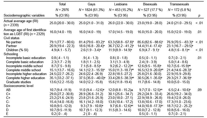 The analytical sample included 2 846 participants ages 13 to 70; of these, 61.3% were identified as gay, 15.2% as lesbians, 17.7% as bisexuals, and 5.8% as transsexual. Table 1 shows the distribution of primary sociodemographic characteristics among the participants as a whole and for LGBT subgroups.