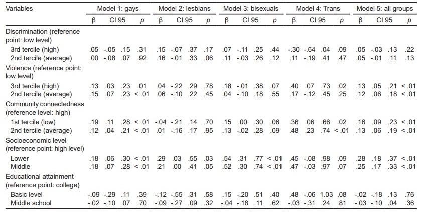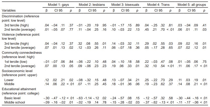 An analysis of the presence of SD for LGBT groups showed that among gay men, this variable is positively associated with an average and high level of violence, –compared to a low level of violence– (β = .15, 95% CI [.07, .23] for an average level of violence; β = .13, 95% CI [.03, .23] for high levels of violence).