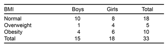 In order to cover the possible variations in the concept of obesity and its construction, we utilised theoretical sampling ( Corbin & Strauss, 2014 ). This means that we included in the study all those types of social actors that could have different views on the problem of obesity. Boys and girls with obesity or overweight and others with a normal Body Mass Index (BMI) (Table 1) were included in the study. They were measured and weighed for a total of 33 boys and girls. None of the children refused to participate, and therefore none were excluded.