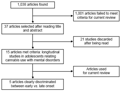 Método: Se realizó una búsqueda en la base de datos de PubMed hasta diciembre de 2016. Se priorizaron los estudios longitudinales en adolescentes que establecieron diferencias entre inicio temprano versus tardío de uso de cannabis. Para ello se utilizó la palabra cannabis en combinación con las principales enfermedades psiquiátricas. Además, se llevó a cabo una búsqueda manual de artículos que aparecían en las referencias.