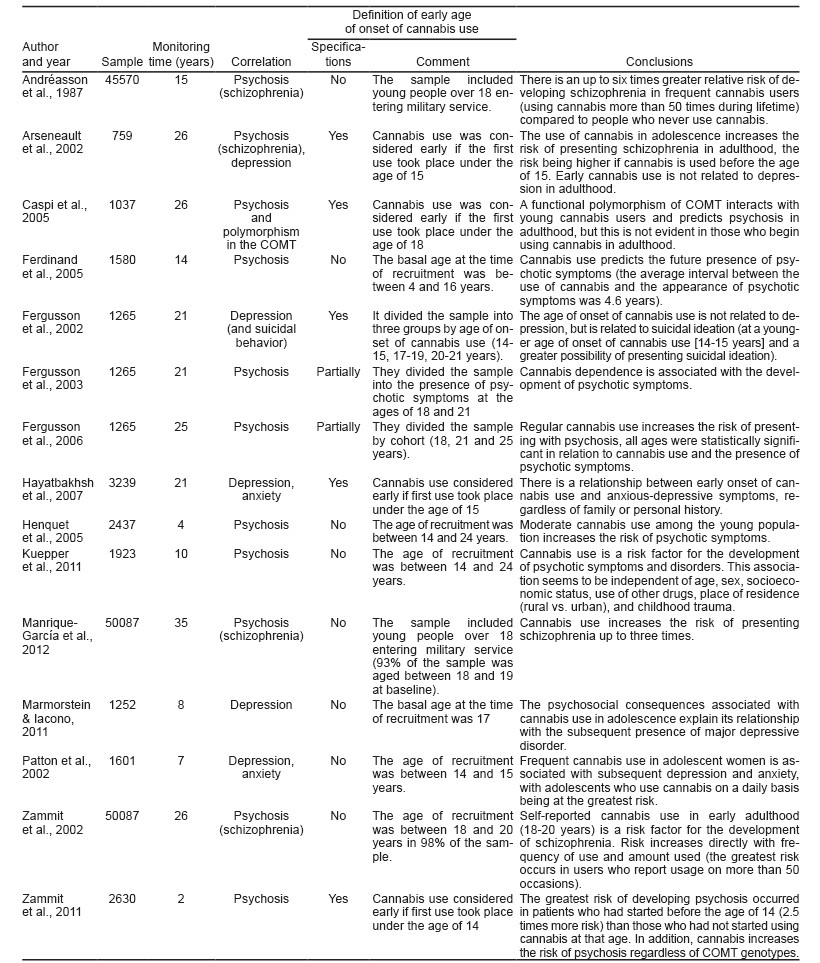 Method: A search was conducted in PubMed until December 2016, focusing on longitudinal researches and prioritizing studies that clearly distinguished between an early and late onset of cannabis use. To achieve the objective, the word “cannabis” was used in combination with the main psychiatric diseases. A manual search of articles that appeared in the references was also conducted.