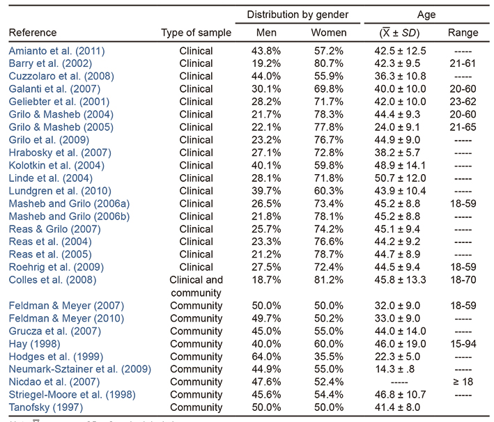 In the 28 selected articles, a purposive, non-probabilistic sampling was used, including nine with community samples, 18 with clinical samples and one with a clinical community sample. This shows that much of the research on BED is conducted on populations of patients with obesity in weight loss programs.