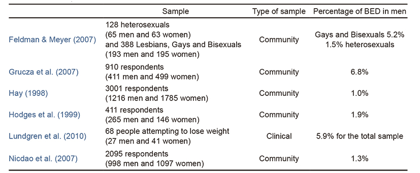 In the community samples in the articles reviewed, prevalence rates in men range from 1.5% to 6.8% (Feldman & Meyer, 2007; Grucza, Przybeck, & Cloninger, 2007; Hay, 1998; Hodges, Stellefson, Jarrell, Cochrane, & Brewerton, 1999; Nicdao, Hong, & Takeuchi, 2007). The comparison between genders shows a higher prevalence in women. As for the clinical sample, in patients with obesity who attend treatment for weight reduction (Lundgren, Rempfer, Brown, Goetz, & Hamera, 2010), a higher prevalence of BED was found than in the community sample (5.9%) for both genders together since the prevalence for each gender is not specified (Table 2). Regarding partial BED, there is a higher prevalence of this syndrome in men (Feldman & Meyer, 2007).