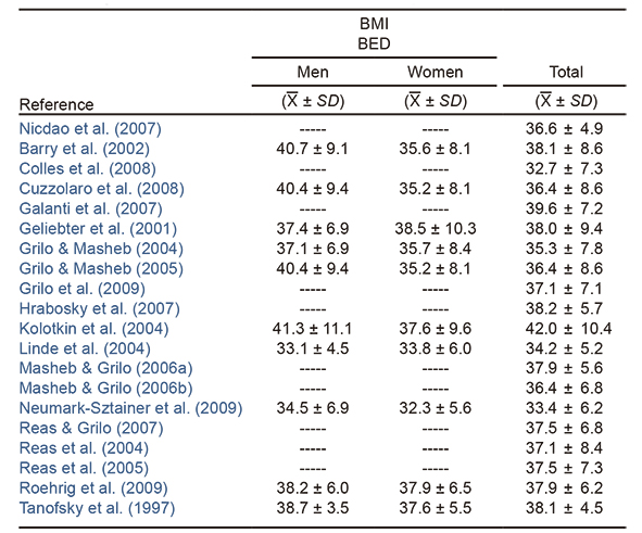 Although it has been established that BED is frequently associated with overweight or obesity, in the case of the present review, only 20 articles considered the body mass index (BMI) of their respondents, where those with BED, both men and women, had BMI averages of 32 to 42. Specifically in men, the average BMI ranged from 34 to 41, which is equivalent to type I (BMI 30 - 34.9) to type III (BMI > 40) obesity (Table 3).