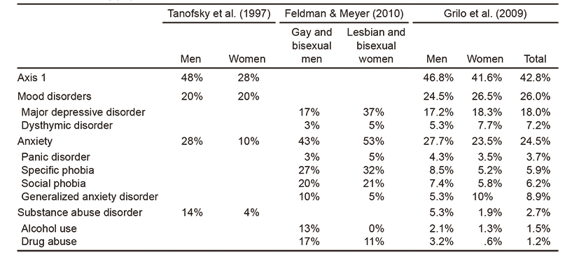 In the present review, only three articles evaluated comorbidity with Axis 1 disorders in the DSM-IV-TR (American Psychiatric Association, 2000) based on a diagnostic interview (Structured Clinical Interview for DSM Axis I Disorders (SCID-I/P) (First, Spitzer, Gibbon, & Williams, 1996), which found that between 46% and 48% of those with BED (both men and women) have at least one psychiatric disorder, the most frequent of which were anxiety disorders (27% to 43%), particularly specific phobia (Grilo, White, & Masheb, 2009; Feldman & Meyer, 2010). At the same time, mood disorders occur in between 20% and 24.5% of men, with major depressive disorder occurring most frequently (Grilo et al., 2009; Feldman & Meyer, 2010) (Table 4).