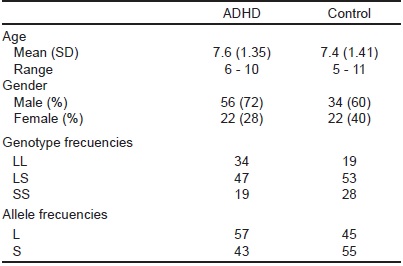 In the present study, 134 unrelated children were recruited among students from first to fifth grade of elementary school at the regional school district of Tepatitlan, Jalisco, Mexico, and evaluated for ADHD by a psychiatrist according to DSM-IV criteria and divided in 78 cases and 56 non-cases.