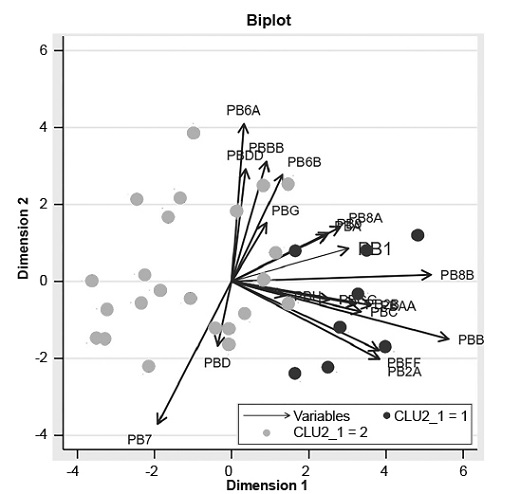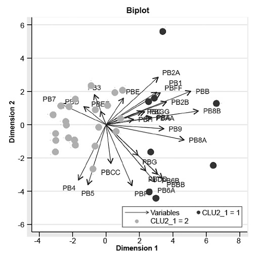 For both male and female subjects, the results of the MACI analysis in adolescents belonging to cluster 1 were found closer to the behavior of the scores of the patient population of the Chilean reference sample. In contrast, the results of the MACI analysis of adolescents belonging to cluster 2 were closer to the behavior of the scores of the non-patient population for the Chilean reference sample. Through the Biplot analysis, a visual analysis of the structure of the clusters was obtained for each sample (females and males), and the results are shown below in Figures 1 and 2.